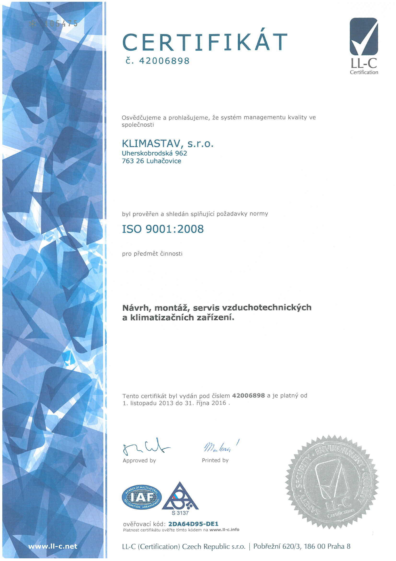 Od roku 2007 je společnost KLIMASTAV, s.r.o. certifikována dle standardu ISO 9001.